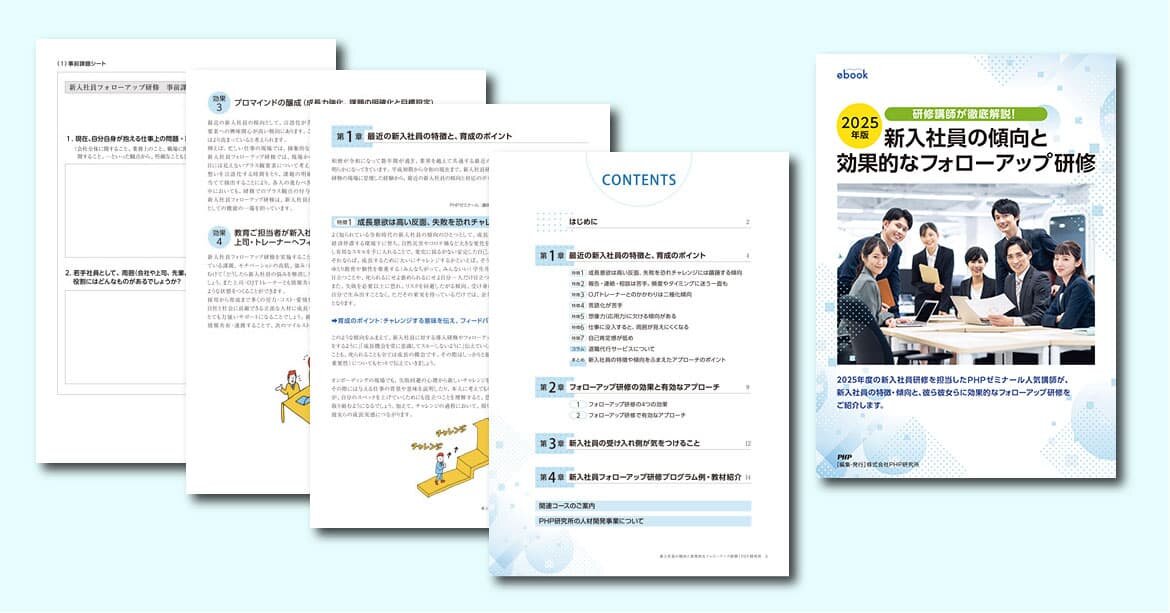 新入社員研修を担当するPHPゼミナールの人気講師が、最近の新入社員の7つの特徴と効果的なフォローアップ研修を解説するebookを無料配布中です。育成のポイントや有効なアプローチ、受け入れ側が気をつけること、フォローアップ研修のモデルプログラムなどもご紹介しています。